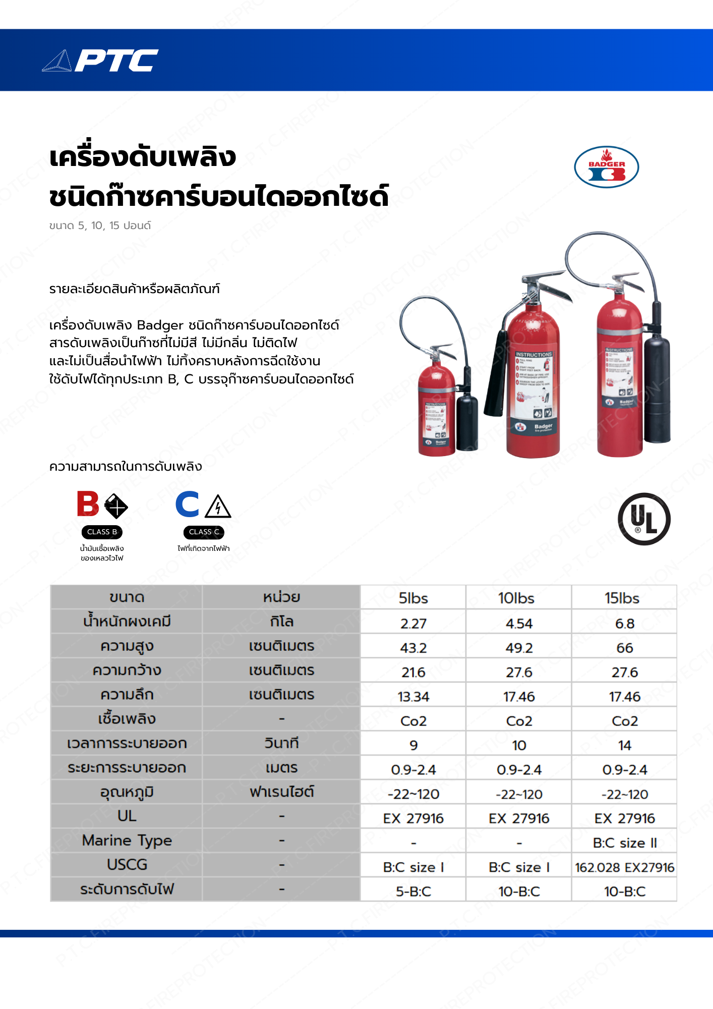 เครื่องดับเพลิง Badger ชนิดก๊าซคาร์บอนไดออกไซด์ สารดับเพลิงเป็นก๊าซที่ไม่มีสี ไม่มีกลิ่น ไม่ติดไฟและไม่เป็นสื่อนำไฟฟ้า ไม่ทิ้งคราบหลังการฉีดใช้งาน