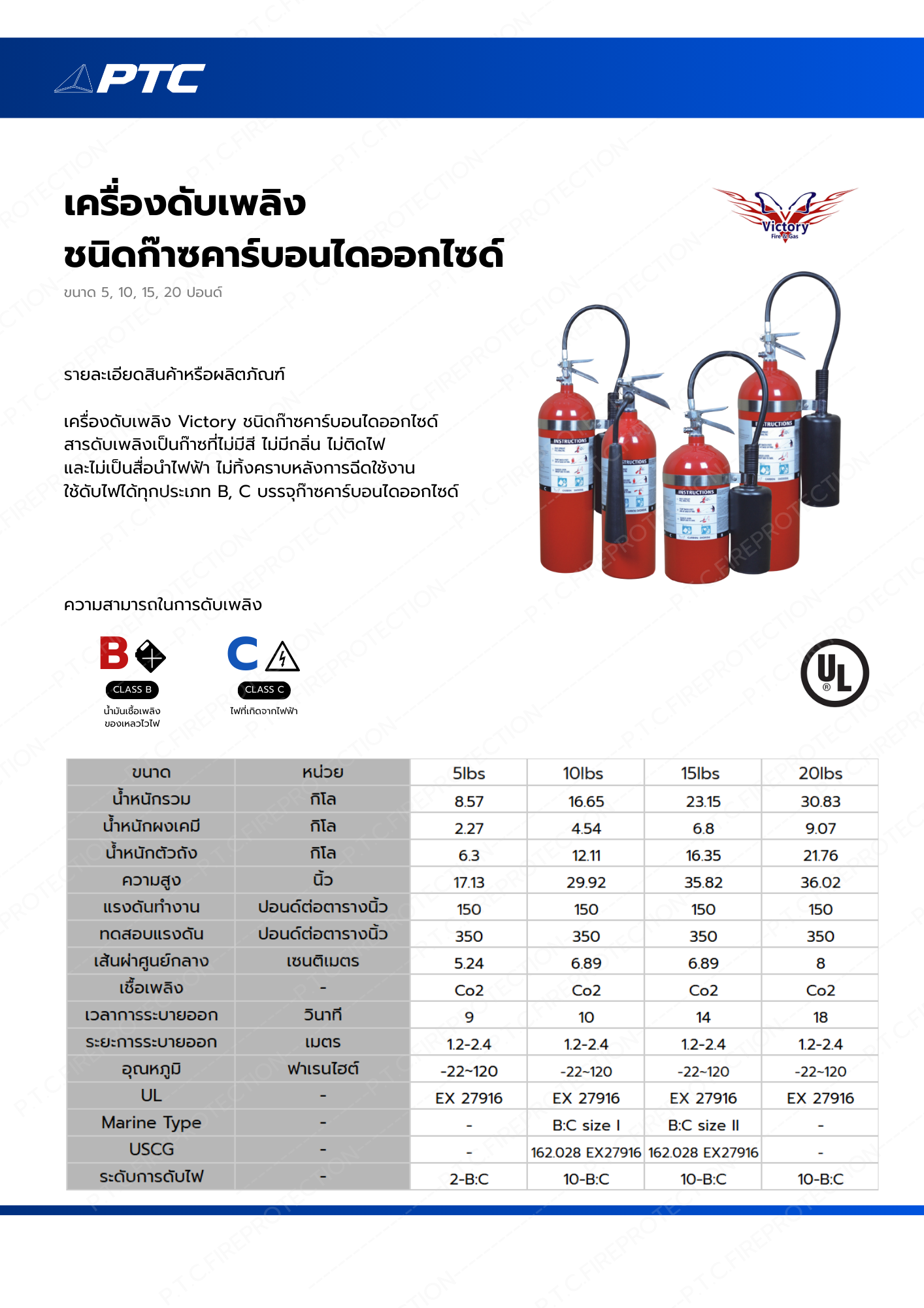 เครื่องดับเพลิง Victory ชนิดก๊าซคาร์บอนไดออกไซด์ สารดับเพลิงเป็นก๊าซที่ไม่มีสี ไม่มีกลิ่น ไม่ติดไฟ