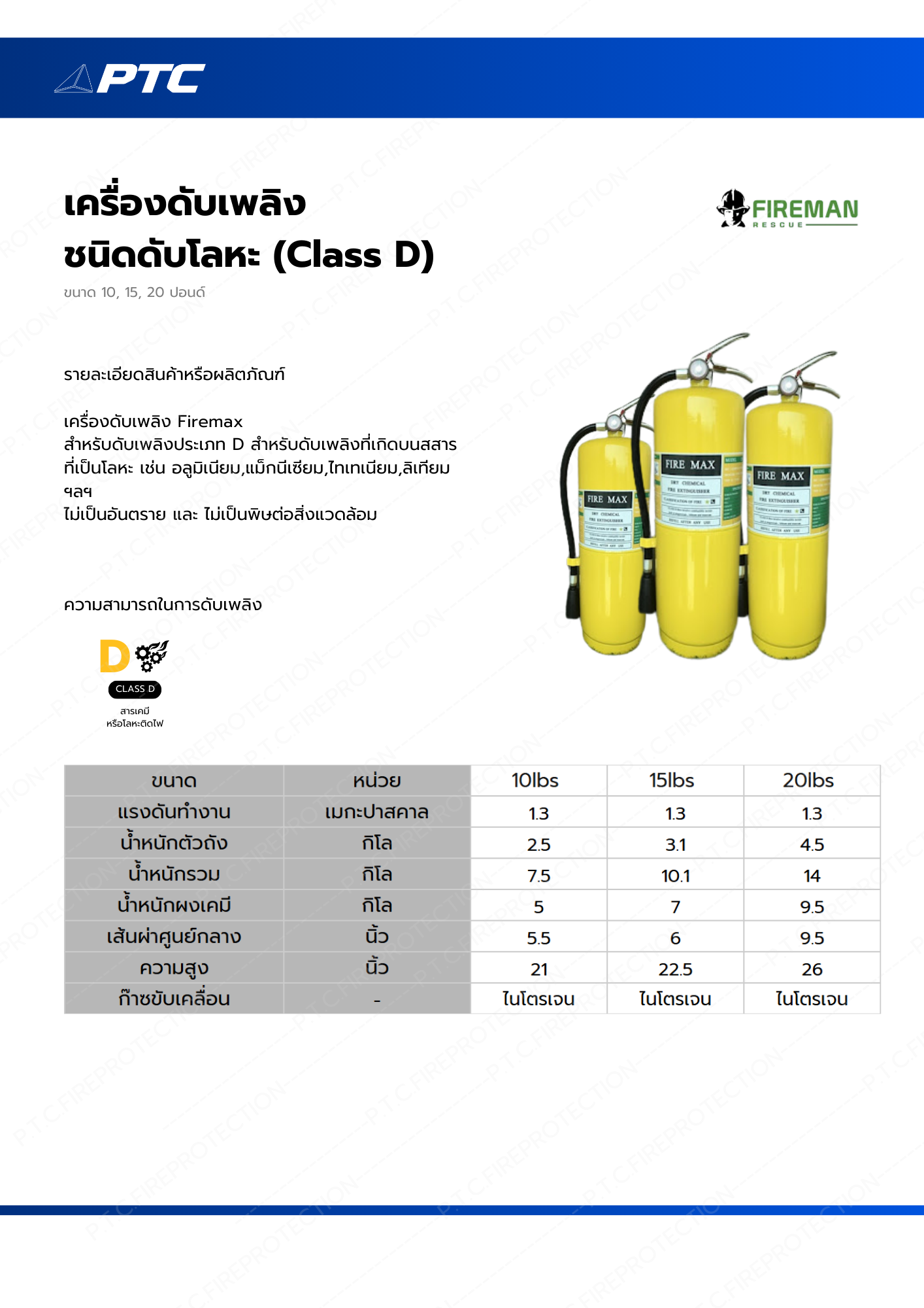 สำหรับดับเพลิงประเภท D สำหรับดับเพลิงที่เกิดบนสสารที่เป็นโลหะ เช่น อลูมิเนียม,แม็กนีเซียม,ไทเทเนียม,ลิเทียม ฯลฯ