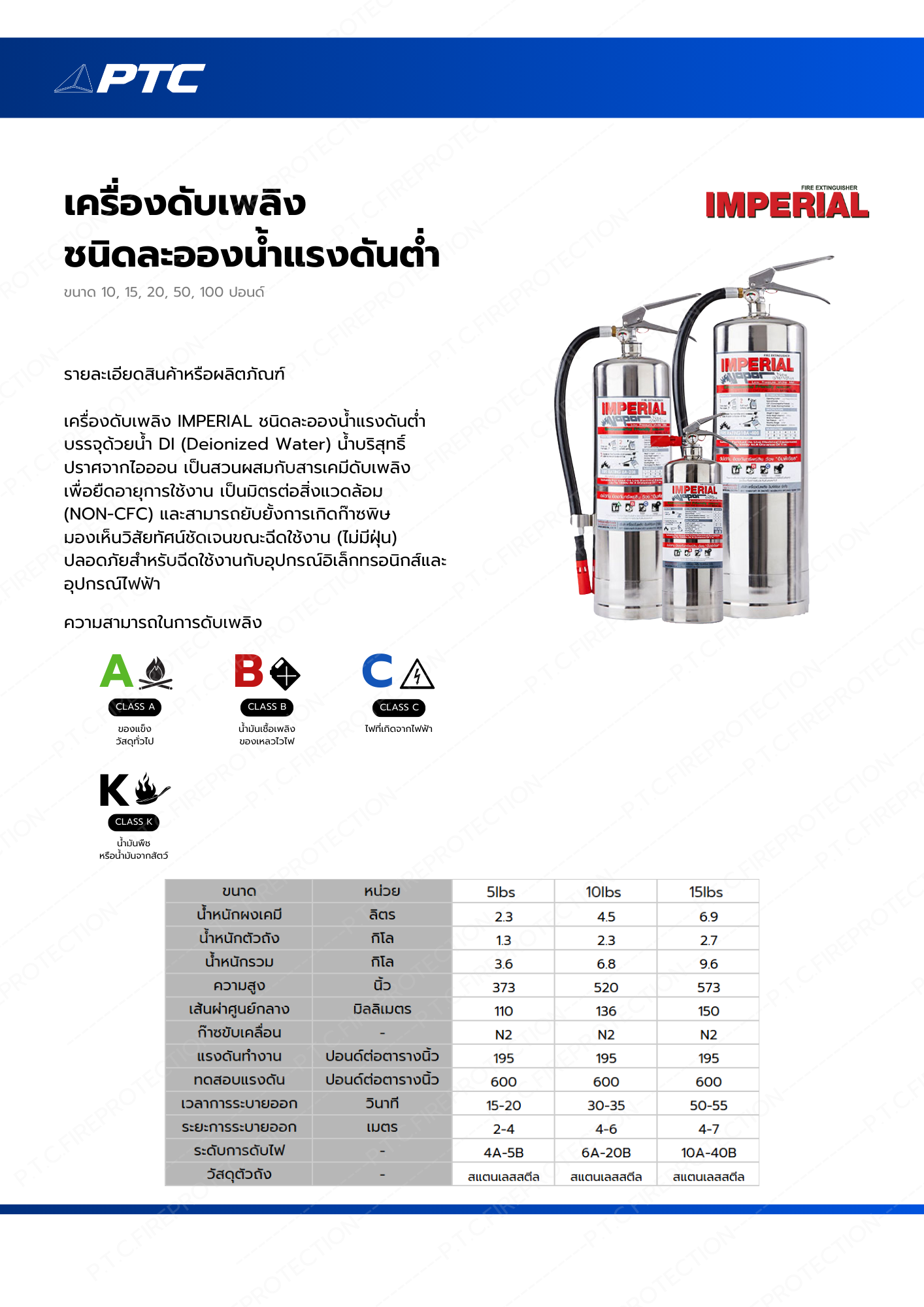 เครื่องดับเพลิง IMPERIAL ชนิดละอองน้ำแรงดันต่ำ บรรจุด้วยน้ํา DI (Deionized Water) น้ําบริสุทธิ์ ปราศจากไอออน
