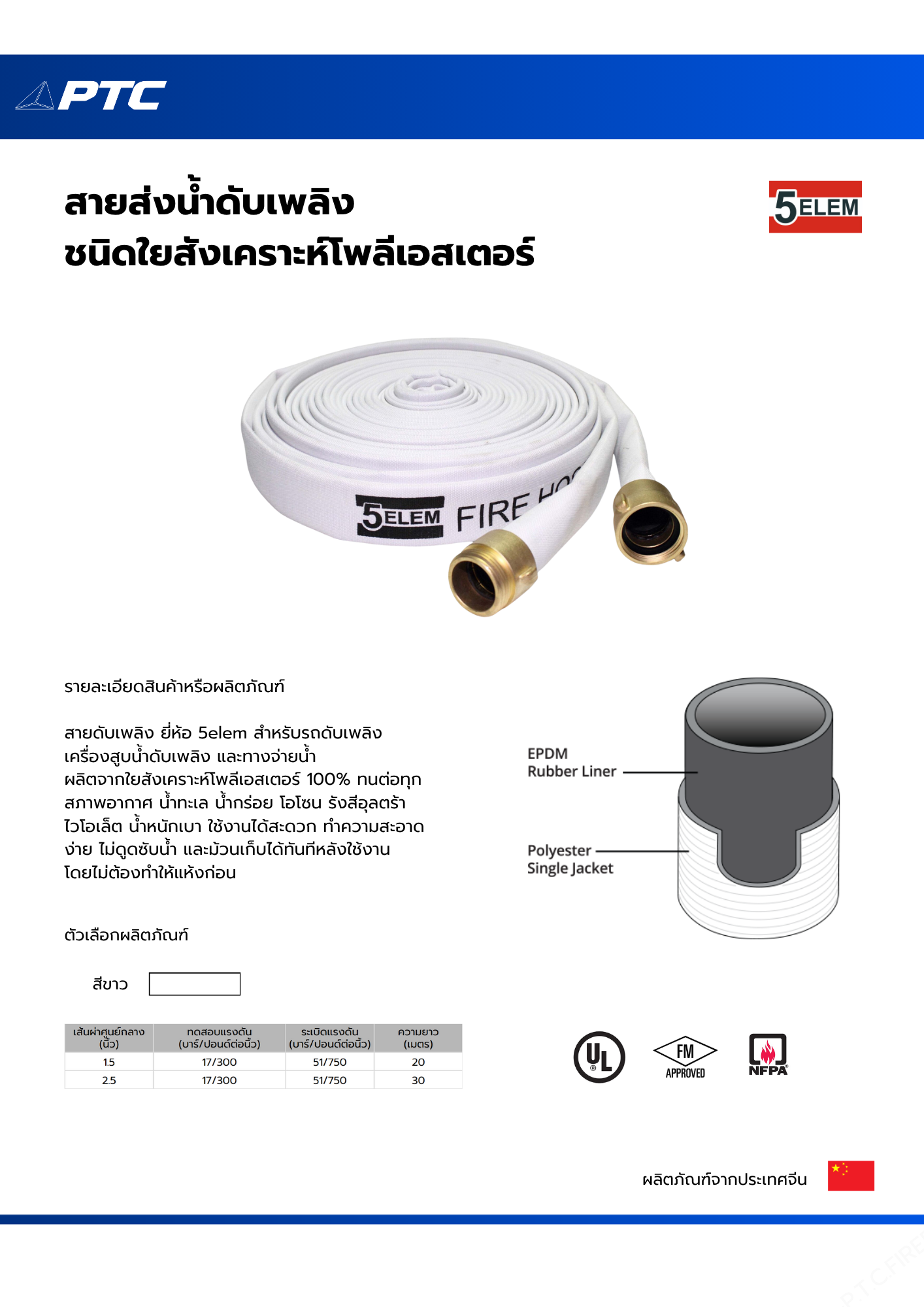 สายดับเพลิง ยี่ห้อ 5elem สำหรับรถดับเพลิง เครื่องสูบน้ำดับเพลิง และทางจ่ายน้ำ