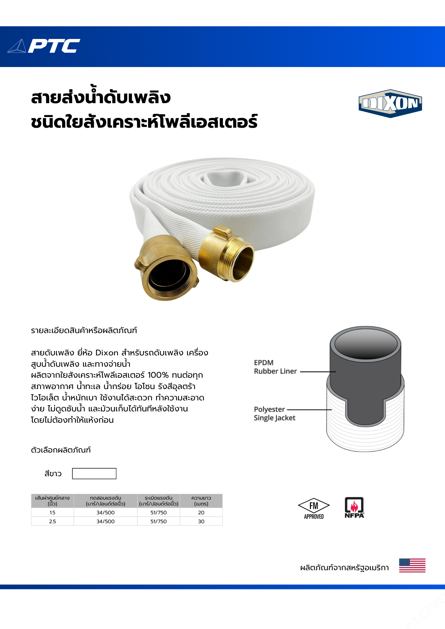 สายดับเพลิง ยี่ห้อ Dixon สำหรับรถดับเพลิง เครื่องสูบน้ำดับเพลิง และทางจ่ายน้ำ ผลิตจากใยสังเคราะห์โพลีเอสเตอร์ 100% ทนต่อทุกสภาพอากาศ น้ำทะเล น้ำกร่อย โอโซน รังสีอุลตร้าไวโอเล็ต น้ำหนักเบา ใช้งานได้สะดวก ทำความสะอาดง่าย ไม่ดูดซับน้ำ และม้วนเก็บได้ทันทีหลังใช้งาน โดยไม่ต้องทำให้แห้งก่อน